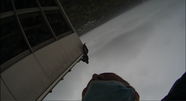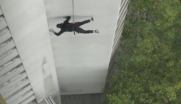 The woman removed the front carabiner from me, and then I heard the man tell me to put my arms under the camera and move away to the front. I leaned forward, took a few steps and found that I felt pretty secure in the equipment. So I tried pushing off the wall and from there the thrill really started.