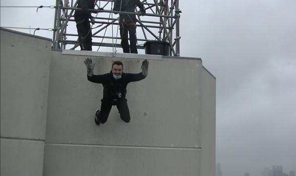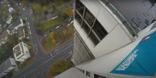 In house running, you run downhill along the wall of a house. There are several locations with different heights all over Germany. I chose the 100- meter Leonardo Royal Hotel in Frankfurt.